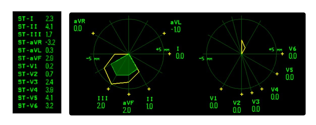 Collects ST values and trends derived from the vertical (limb leads) and horizontal (chest leads) planes into an integrated display. The maps are multi-axis portraits of the patient’s ST segments as measured with the ST/AR algorithm.