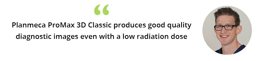 “I chose the Planmeca ProMax® 3D Classic imaging unit based on the fact that it offers Planmeca’s proprietary Planmeca Ultra Low Dose imaging protocol. This facilitates 3D imaging at an even lower patient radiation dose than standard 2D panoramic imaging, which is an important factor in the treatment of patients at my practice. The Planmeca ProMax 3D Classic produces good quality diagnostic images even with a low radiation dose, and I also like Planmeca Romexis®, the open source software platform of this CBCT unit.”